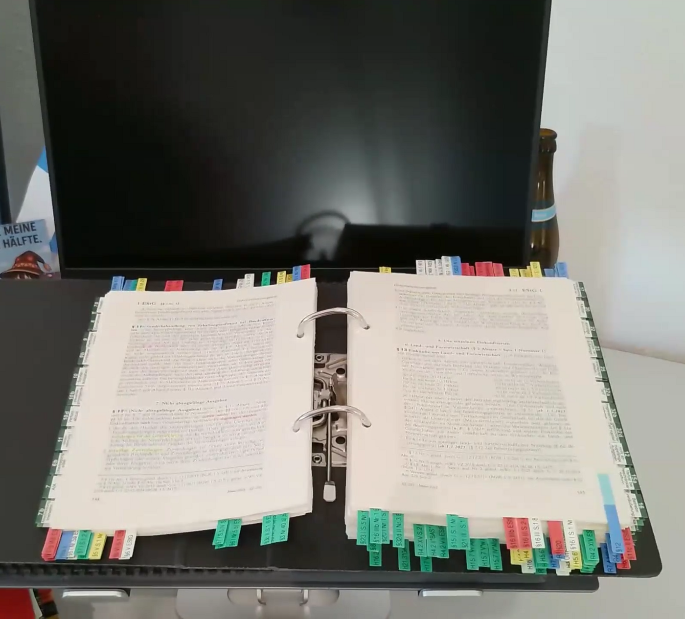 Alexander hat die Gesetze komplett neu organisiert: Er nahm die Seiten aus den Backsteinen heraus und sortierte sie in DIN-A5-Ordner, pro Klausurtag ein Ordner mit allem, was er brauchte: