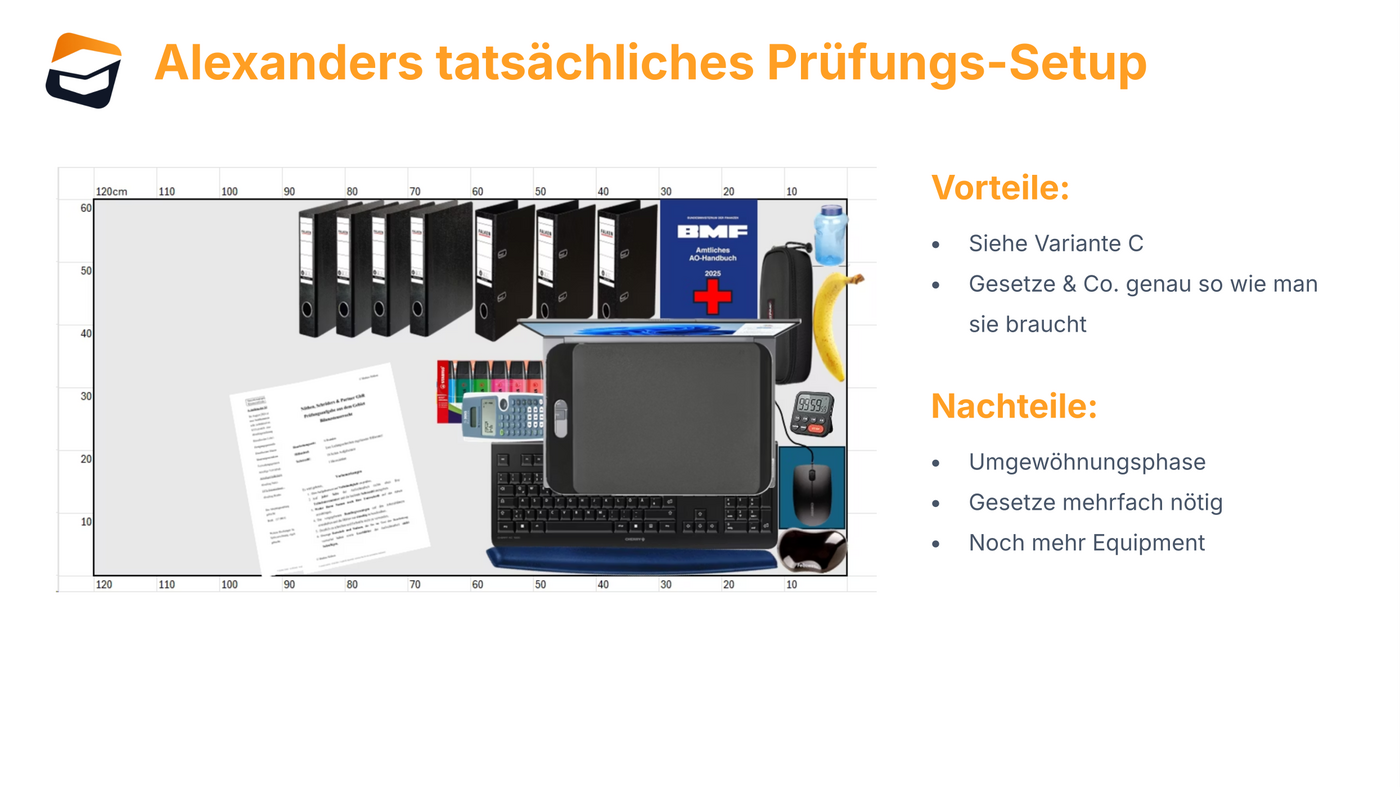 Klärt euer Set-up vorab mit der Kammer. Laptop-Ständer und Monitorarme waren bei Alexander erlaubt, das kann aber je nach Steuerberaterkammer variieren.